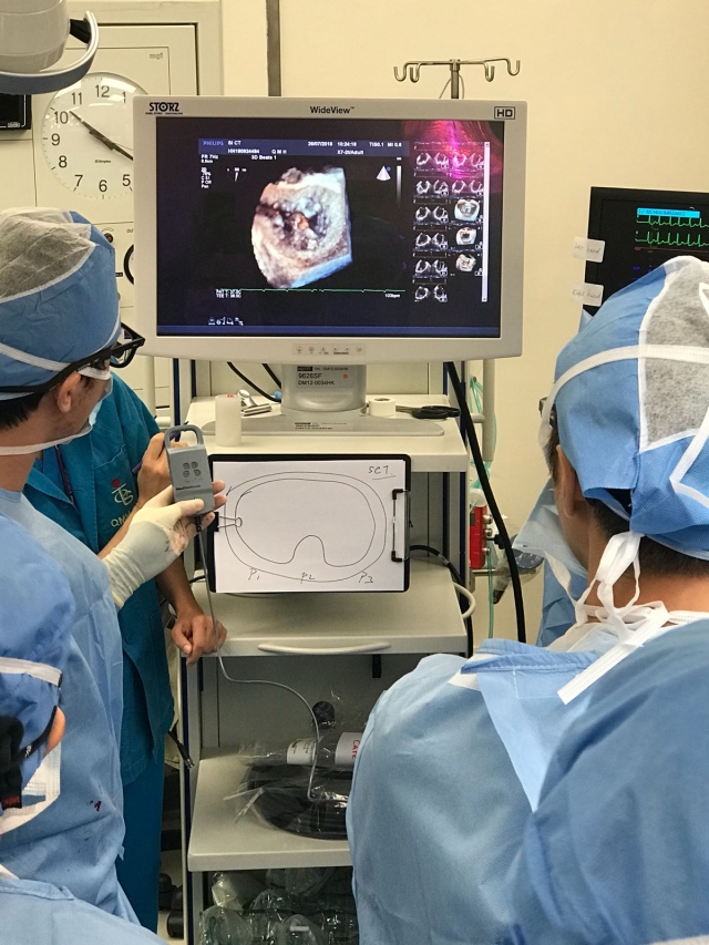該院心胸外科、心臟暨胸肺麻醉科,連同港大醫學院心臟內科,今年7月完成亞洲首宗經心尖微創二尖瓣修復手術。心胸外科顧問醫生陳泰良指,此手術只需在病人胸側開一個4至5厘米切口,將微創手術儀器從心尖插入心臟,將人工腱索打入脫垂位置,拉緊固定在心尖外即可;手術過程需要麻醉科及心臟科醫生,透過食道超聲波監察,放置人工腱索位置是否準確。