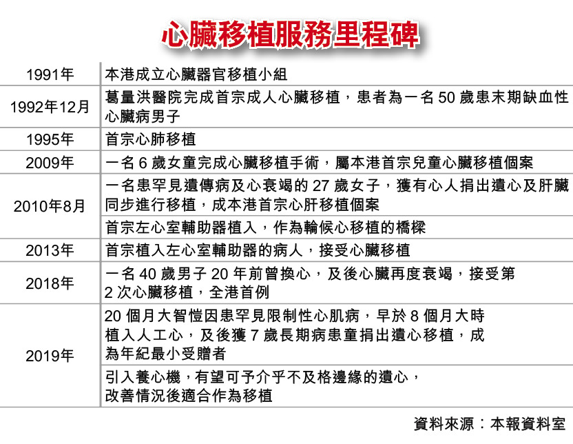 事實上,本港每年約有10名有心人捐出的遺心,是處於邊緣水平不能用作移植,區永谷透露,瑪麗醫院去年耗資250萬元,引入全亞洲首個心臟照護系統,將介乎可移植水平邊緣的遺心,利用照護系統改善遺心至合適作移植的情況。