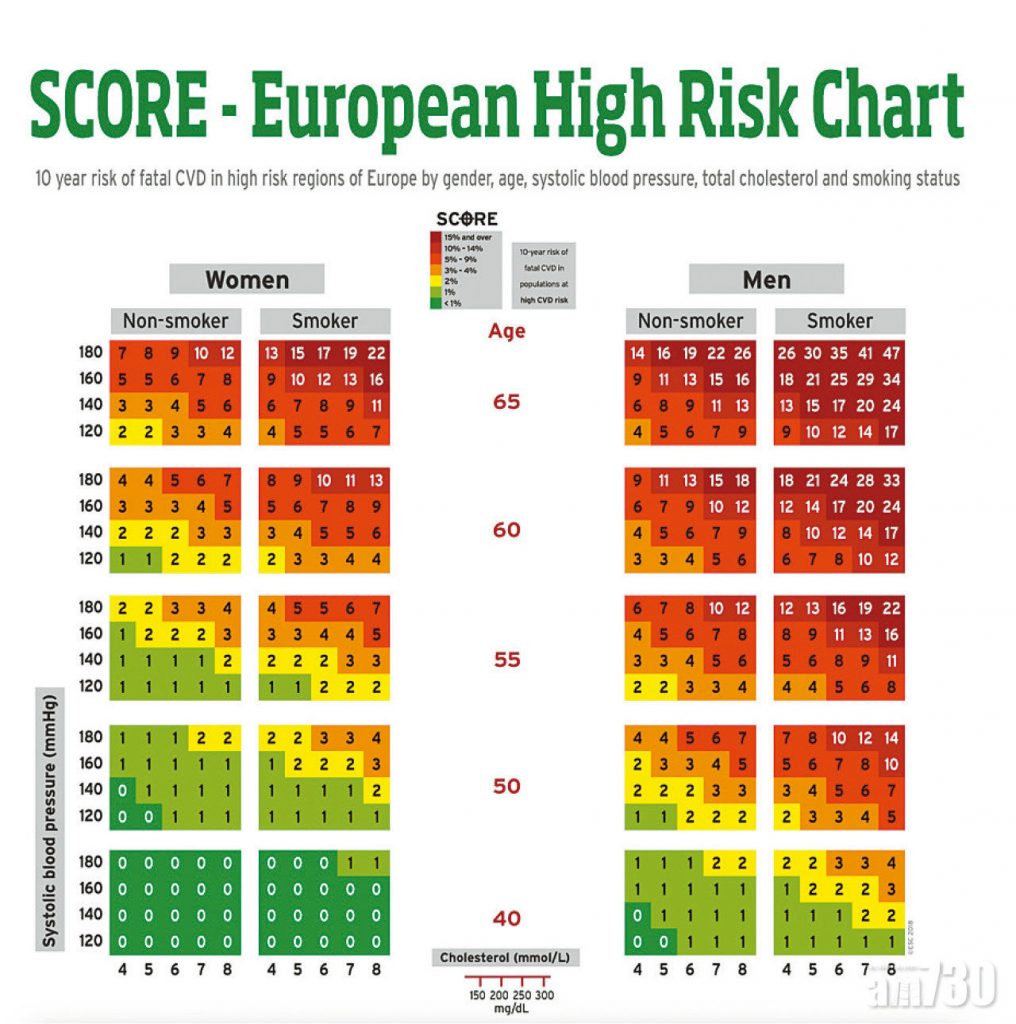 根據新指引,「超高風險」定義是證實患上冠心病、心肌梗塞、缺血性中風或曾作「通波仔」或搭橋手術等、有糖尿病及併發症或嚴重腎衰竭等。「高風險」是指病人有先天性膽固醇或嚴重高血壓等、有糖尿病逾十年或中度腎衰竭等病患。「中度風險」乃患糖尿病少於十年及沒有冠狀動脈栓塞風險的年輕病人,或被SCORE冠心病評估表評分為十年內有1至5%致命冠心病風險。「低風險」即是SCORE評為十年內患致命冠心病風險低於1%。