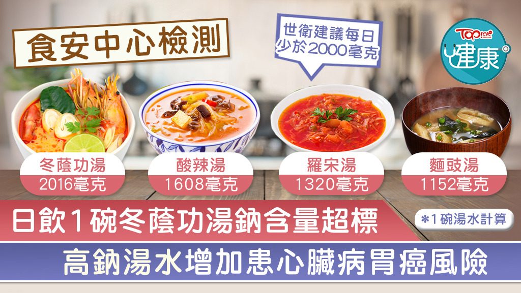 高納湯水可引致心臟病及中風,並有機會增加罹患胃癌的風險。港人愛飲湯水,但市面上不少湯水鹽分高,每日飲一碗可能已超出世界衞生組織建議的鈉攝取量。食物安全中心曾檢測本港食肆售賣的湯水,發現有餐廳的冬蔭功湯1碗的鈉含量已逾2000毫克,超出世衛建議的攝取上限。