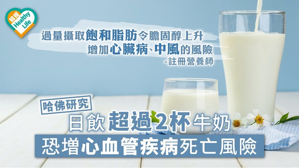 多飲牛奶恐損心血管健康,甚至增加死亡風險?美國哈佛大學發表研究,顯示每日攝取超過2份乳製品,例如飲超過480毫升牛奶,或會增加死亡風險。有註冊營養師表示,牛奶富含飽和脂肪,過量攝取會令膽固醇上升,從而增加心臟病等風險,建議以脫脂牛奶取代牛奶,以降低風險。