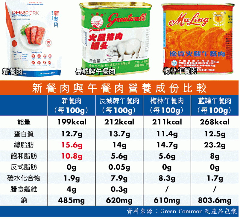 記者比較新餐肉聲稱成份與市面常見豬肉製午餐肉罐頭的營養標籤,發現新餐肉熱量只是略低於傳統午餐肉。新餐肉總脂肪含量為每100克達15.6克,較梅林牌午餐肉14.7克及長城牌午餐肉14克脂肪含量更高。15.6克新餐肉總脂肪含量中,更有10.8克為飽和脂肪。