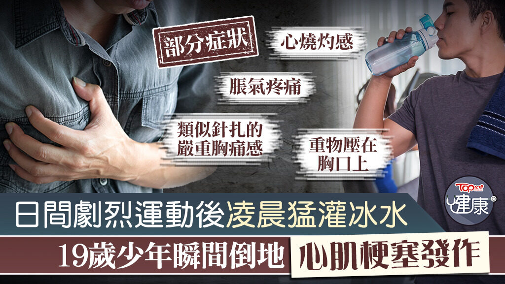 綜合台灣媒體報道,一名19歲林姓男大學生,日間進行一連串密集劇烈的賽事,直至凌晨4、5點感到又熱又渴,於是猛灌兩大杯冰水。喝下瞬間,他即時感到胸口卡住又緊縮,隨後開始冒冷汗、全身無力倒地,送院急救後發現是急性心肌梗塞。