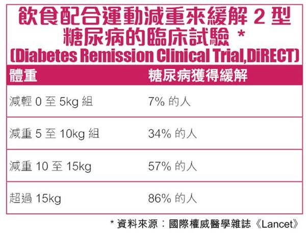 國際權威醫學雜誌《Lancet》,發表了一篇通過控制飲食配合運動減重來緩解2型糖尿病的臨床試驗(Diabetes Remission Clinical Trial,DiRECT)。研究者從英國49家醫療機構招募20至65歲、病史在6年以內、體重指數(BMI)27至45的2型糖尿病人,148人作為對照組維持常規藥物治療,飲食控制組的137位受試者,暫停了所有降糖藥及降壓藥物治療,並採取3至5個月的替代飲食,隨後過渡為2至8周正常飲食,之後在醫生指導下,進行長期體重控制,監測減重效果及糖尿病緩解情況。