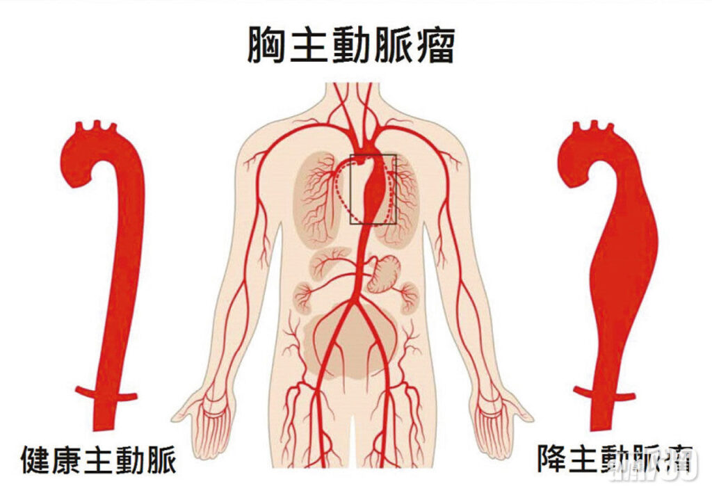 中大醫學院賽馬會公共衛生與基層醫療學院黃至生教授指,主動脈是心臟輸出血液至全身的第一道通道,分升主動脈、主動脈弓和降主動脈,而幾個地方都有可能產生胸主動脈瘤,「不過此症並非有一個實體的腫瘤,而是主動脈的彈性減少,擴張後未能回彈,如果主動脈最大直徑大過或等於4.5cm,又或比相鄰正常主動脈的直徑大超過50%,便算是患上胸主動脈瘤。」