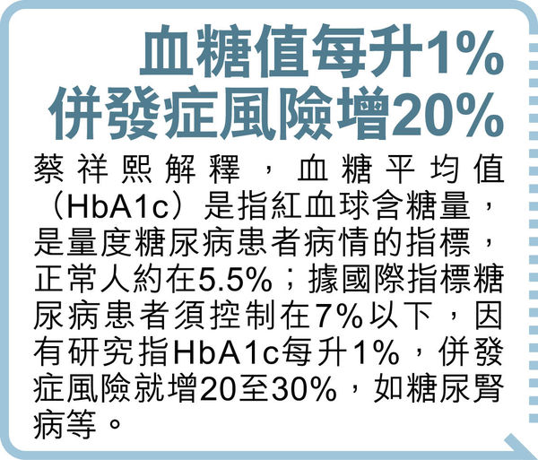 報告又提到,糖尿病可誘發多種併發症,包括37.7%患者有糖尿腎病,於普通科及專科就診患者中,分別有1成半及3成人有3期或更晚期慢性腎病。醫管局糖尿病服務中央委員會質素保證小組委員會主席蔡祥熙提醒,僅靠藥物不足以控制血糖水平,籲患者調節飲食及多做運動。
