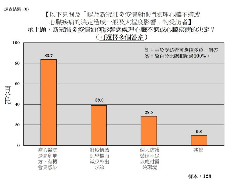 香港中文大學傳播與民意調查中心助理總幹事梁家權公布調查結果,約六成(60.6%)受訪者表示疫情對他們處理心臟不適或心臟疾病的決定有一般或大程度的影響,其原因主要是「擔心醫院是高危地方,有機會受感染」 (83.7%),其次是「對疫情感到恐懼而減少外出求診」 (39%)。當問到他們對心臟不適的處理,接近七成半(74.4%)受訪者在過去12個月曾經出現心臟不適的徵狀(如胸口痛、氣促、暈眩及心悸等等),當中近七成半(73.5%)卻表示沒有到醫院或診所求醫。幸好大部份患者仍有依期覆診及進行治療,約八成(80.8%)在過去12個月曾到訪醫院進行檢查、覆診或手術;超過七成(72.4%)曾到訪醫院領取心臟病藥物,只有非常少數(1-2%)沒有如期進行檢查、覆診、手術或領取藥物。