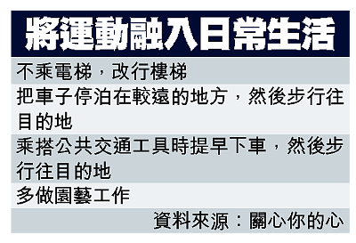 【本報訊】心臟病是本港第二號殺手。政府的統計報告指出,全港每十名死者中,就有一人死於冠心病,平均每日就有十五人因心臟病病發而死亡。一項調查發現,定期運動除有助減低心臟病病發率外,更可提升患者的自我勝任感( Self-efficacy),間接提升生活質素。 記者:趙燕婷