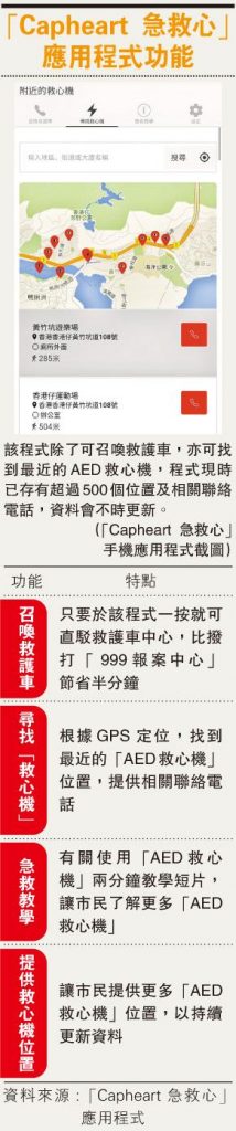 最近該程式入圍香港科技園首辦的「全城橋王挑戰賽」,Michael稱,曾邀請多間社會服務機構合作都沒回音,盼參賽可讓更多人關注心臟病,研發程式雖沒什麼花費,但耗時間,即使不能勝出,他們仍會繼續更新,讓更多人提供AED位置,以救助更多心臟停頓者。