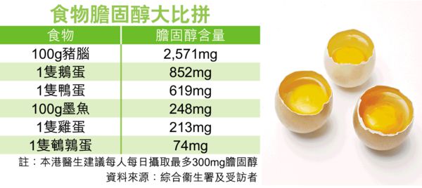 不少食物的膽固醇含量高,例如一隻雞蛋的膽固醇含量,超過200mg,香港營養學會候任會長張智良稱,鴨蛋的膽固醇更高,一隻已有619mg、鵝蛋則有852mg。「任何食物都應適可而止地進食,一般人每星期可吃2至3隻雞蛋。」