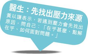 出現壓力大徵狀的患者,一般都以為自己患了重病,故四處求醫,卻是醫不好。黃以謙說,壓力的來源並非外在,而是內在的心理因素,「兩個人同時被上司責罵,當中一人數秒後已忘記了,但另一人卻耿耿於懷。」他解釋,因問題源於自己,解鈴還需繫鈴人,「要自己看開點,找出解決辦法,才可釋懷,否則容易出現焦慮、抑鬱等精神病徵,影響夫妻關係、婆媳問題、子女教養等問題。」
