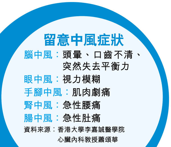 他續說,心房顫動引起的中風,往往沒有任何徵兆,且一般都是突襲式,以眼中風為例,因為視網膜血管阻塞,視力會突然變得模糊;如果手腳中風,則因血液供應被堵塞,會出現肌肉劇痛;至於腸中風則會出現猶如腹膜炎般的痛楚;而腎中風嚴重者,更會引發腎衰竭。
