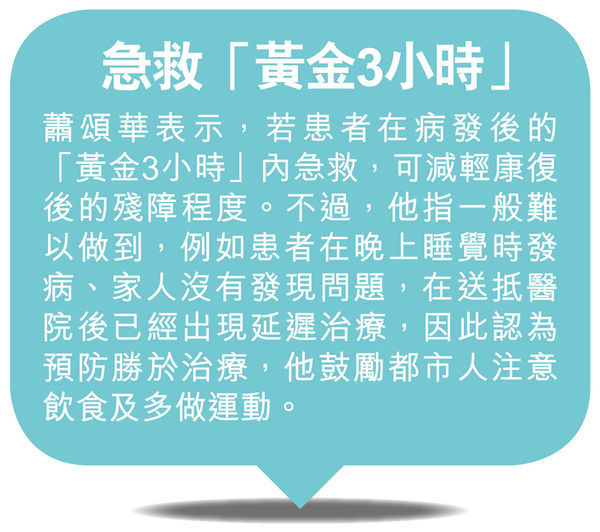 中風有時候比癌症還可怕。香港大學李嘉誠醫學院心臟內科教授蕭頌華表示,「中風」是源於中國古文,意指突然、短時間內發生,當腦部有部分血管被阻塞或爆裂,腦組織不能得到充分的養份及氧氣,便會導致腦細胞壞死。香港每年就有1.3萬宗新增個案,數字名列世界前茅,其中70%個案是因為「三高」,即高血脂、高血壓、高血糖引起,「但被阻塞的血管較為細條,對患者的影響較細」;其餘個案則由心房顫動引起,其影響性亦較大。