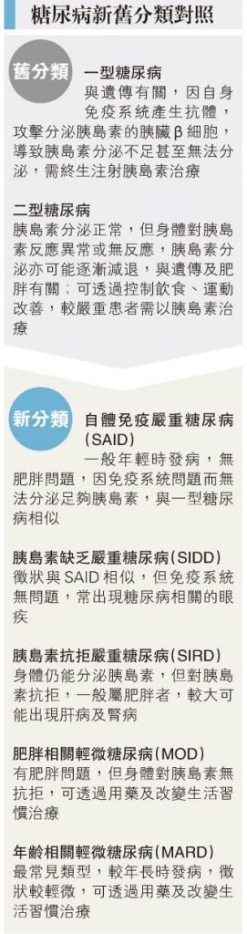 瑞典隆德大學(Lund University)糖尿病中心與芬蘭分子醫學研究所(Institute for Molecular Medicine Finland)研究員分析14,775名當地糖尿病人,按確診年齡、身體質量指數(BMI)、胰島素抗體「穀氨酸脫羧酶抗體」(GADA)水平,以及胰臟β細胞功能與胰島素對抗程度等指標分類,發現糖尿病可細分為5類,包括因免疫系統問題缺乏胰島素分泌的嚴重糖尿病、非因免疫系統問題但缺乏胰島素分泌的嚴重糖尿病、身體對胰島素抗拒的嚴重糖尿病、肥胖導致的輕微糖尿病,以及與年齡相關的輕微糖尿病(見表)。它們有不同的併發症風險,亦非同一種糖尿病的不同階段。